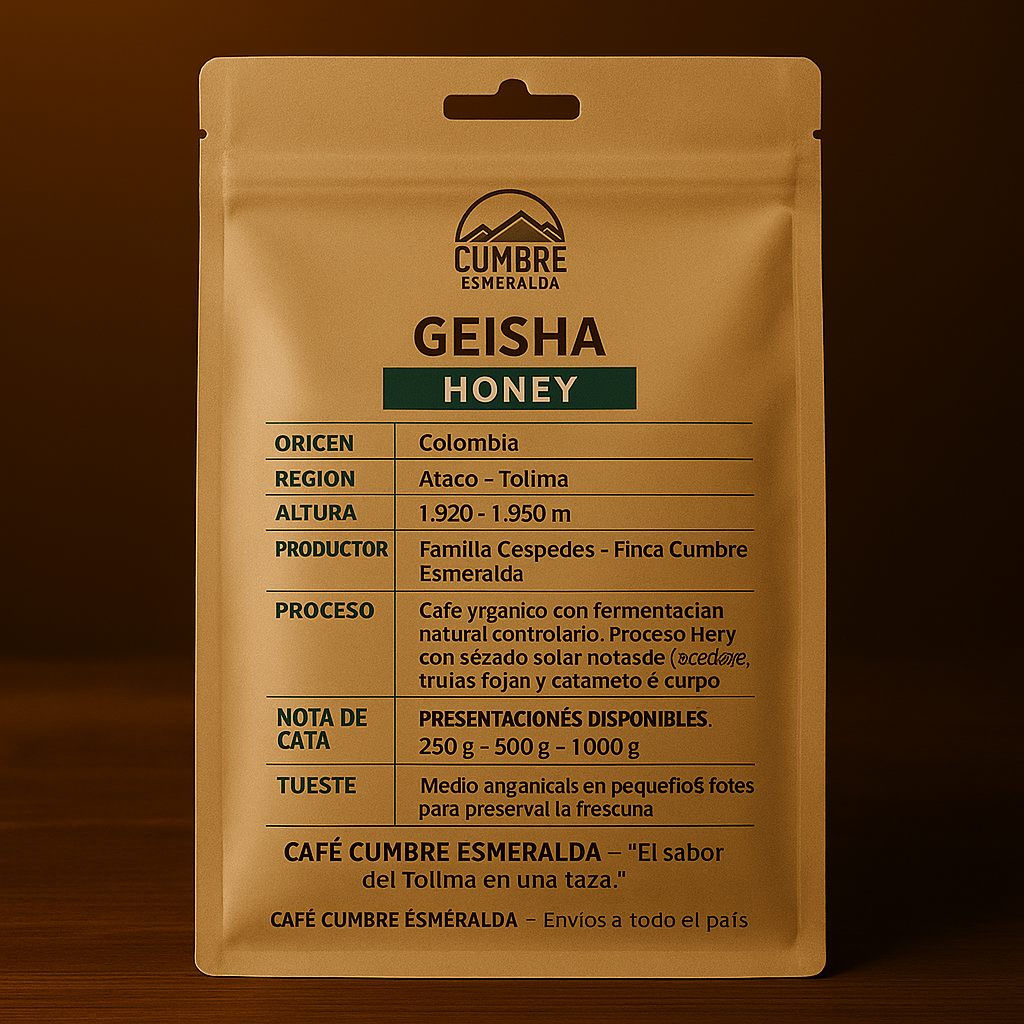 Cumbre Esmeralda nace del corazón de una familia cafetera del Tolima. A 1.820–1.950 m, entre suelos volcánicos y microclimas únicos, cultivamos la variedad Geisha con proceso Honey, donde parte del mucílago natural del café se conserva durante el secado, dándole un toque dulce, sedoso y frutal inconfundible.
