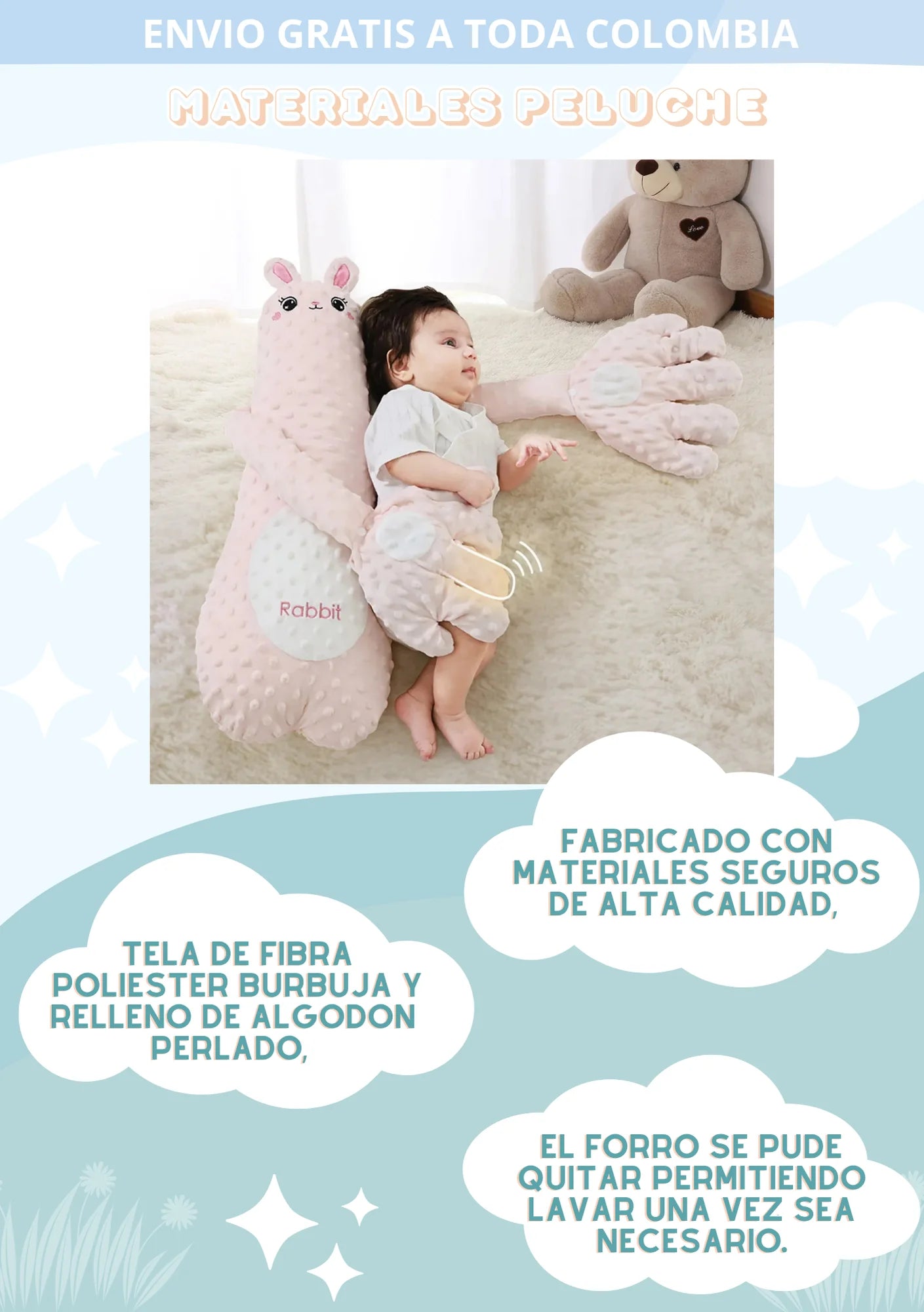 El Muñeco para Dormir Bebé está relleno de frijoles rojos naturales que, al ser calentados, proporcionan una terapia de calor suave y reconfortante. Este calor ayuda a aliviar las molestias de la barriga (gases y cólicos) y relaja a tu bebé, imitando la calidez de tu cuerpo. Además, su diseño ergonómico y forma de conejito de peluche, con una textura de fibra de poliéster ultrasuave, le permite a tu pequeño acurrucarse y sentir un abrazo acogedor.
