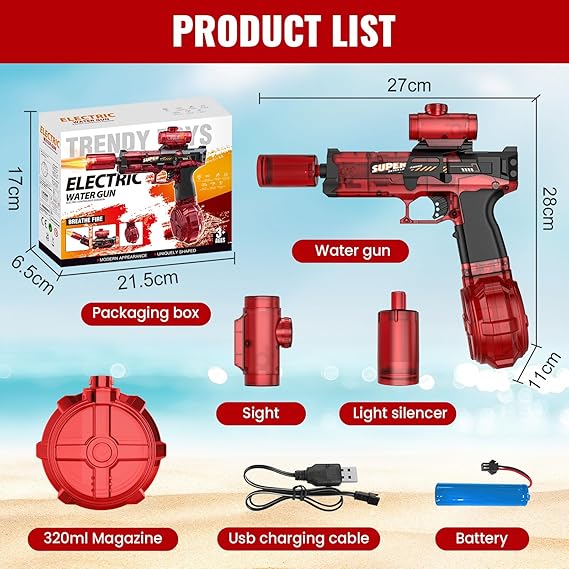 Gracias a su tanque de 320 ml y batería de 500 mAh, tendrás hasta 25 minutos de diversión continua y cientos de disparos sin parar. ¡Carga rápido y vuelve a la acción en segundos!
