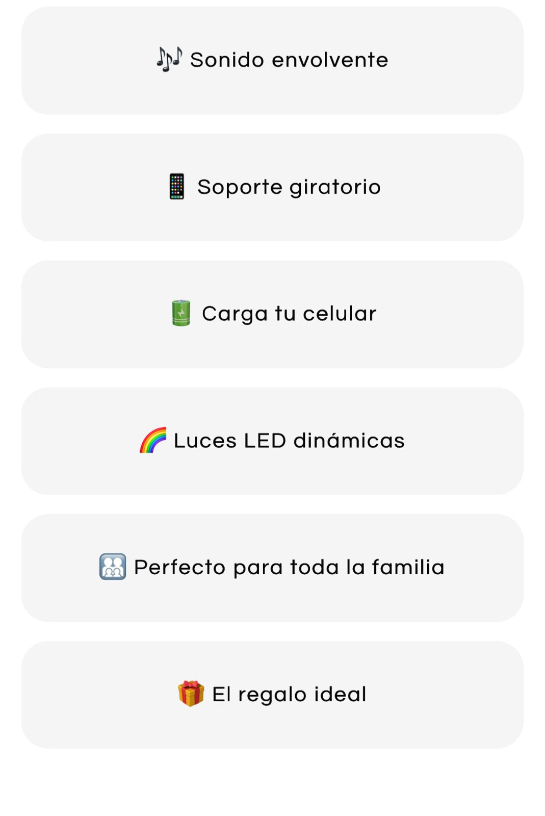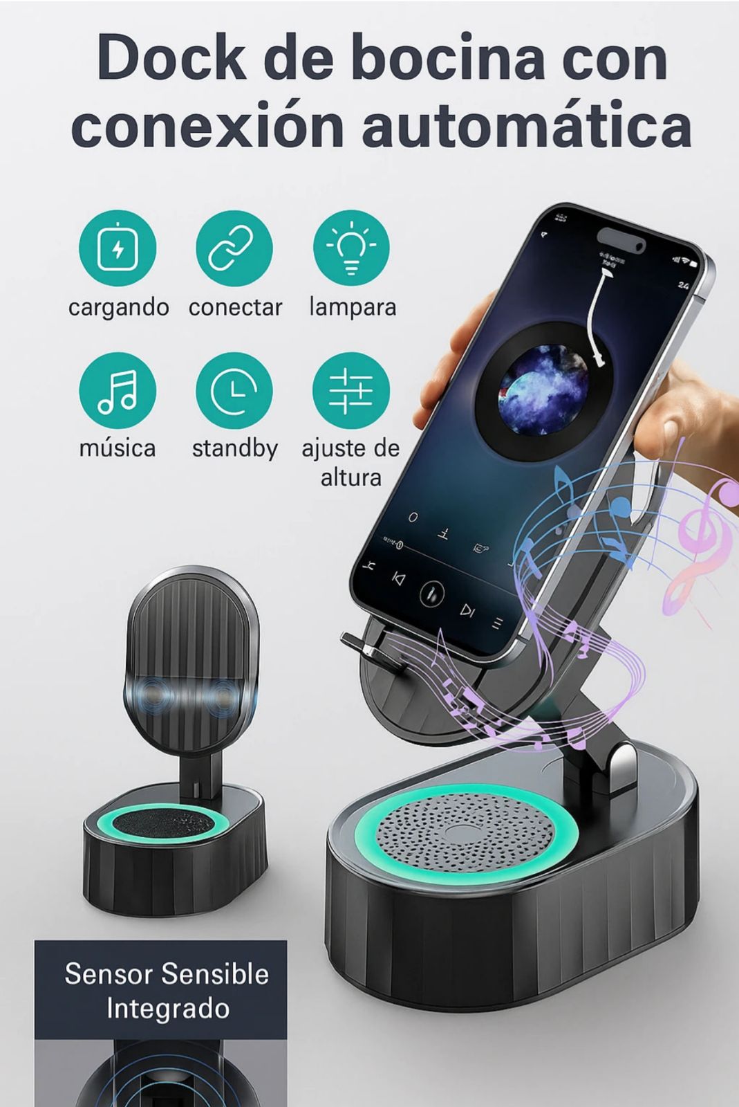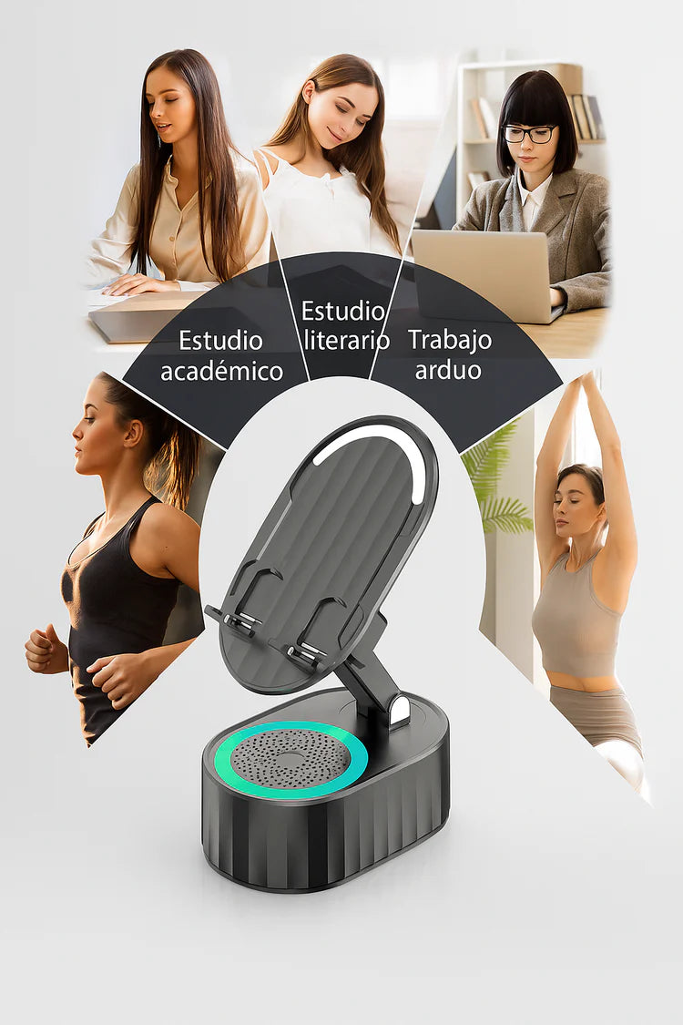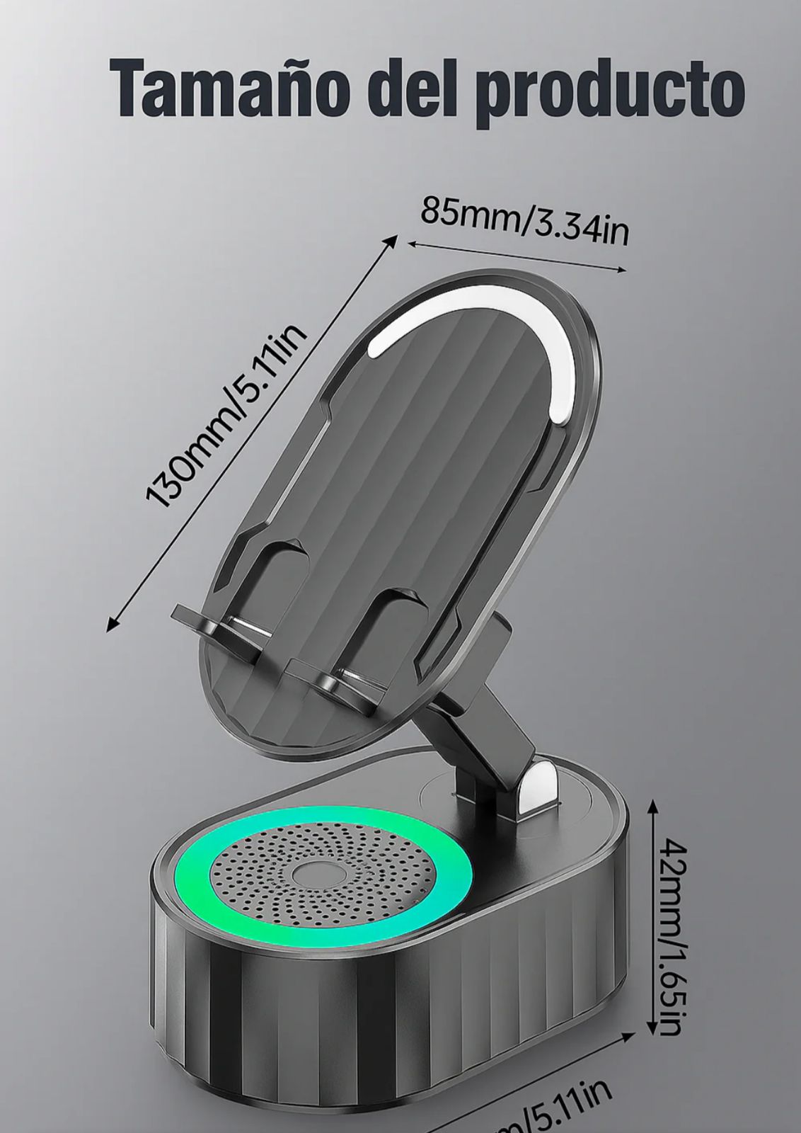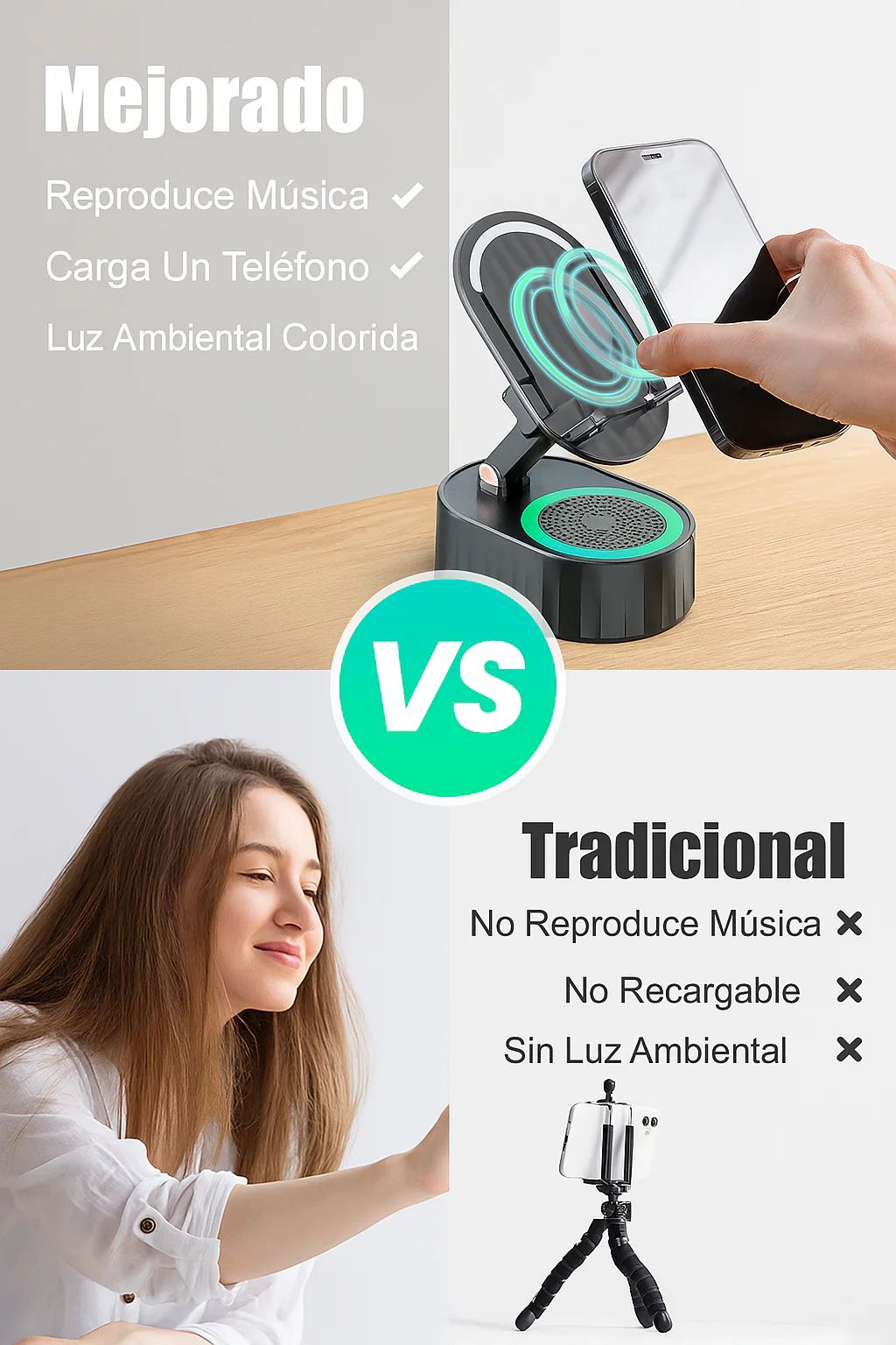 Transforma la manera en que disfrutas tu música, videos y momentos en familia con nuestro Soporte Parlante 4 en 1. Más que un altavoz, es el aliado perfecto para tu día a día: combina sonido envolvente, soporte ajustable, carga alámbrica, powerbank y luz ambiental en un solo dispositivo.